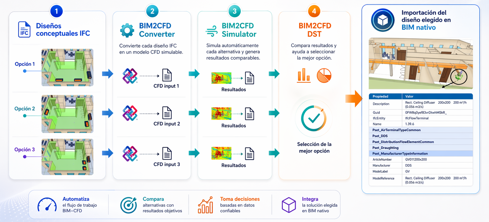 - BIM2CFD DST: Módulo orientado a la comparación de resultados y al apoyo en la selección de la mejor opción.