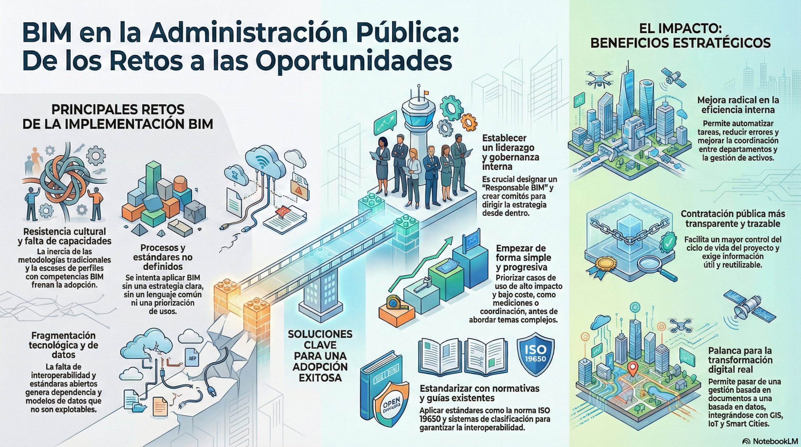 Conclusión central: la implantación BIM en el sector público es, ante todo, un reto organizativo, cultural y estratégico (gobernanza, procesos, capacidades y datos), más que puramente tecnológico.